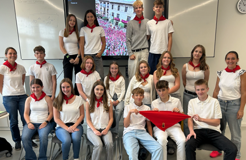 (ADL) Nachdem sich im März 2025 17 Neuntklässler*innen des Campe-Gymnasiums im Rahmen eines Erasmus+ - Austauschprojekts auf den Weg nach Cintruénigo in Nordspanien gemacht haben, erinnern wir uns in dieser Woche ganz besonders an unsere Austauschpartnerinnen dort. In dem kleinen Städtchen findet jedes Jahr vom 07.-13.09. das traditionelle Stadtfest statt, über das uns viel und begeistert berichtet wurde. Als Zeichen ihrer Gastfreundschaft übergaben die Spanierinnen uns rote „pañuelos“. Das sind Halstücher, die zu den Feierlichkeiten traditionell mit weißer Kleidung getragen werden. Also haben wir es uns nicht nehmen lassen, diese Woche in passender Kleidung Grüße an unsere Freundinnen in Spanien zu senden und so diese einmalige Erfahrung auch hier noch einmal aufleben zu lassen!