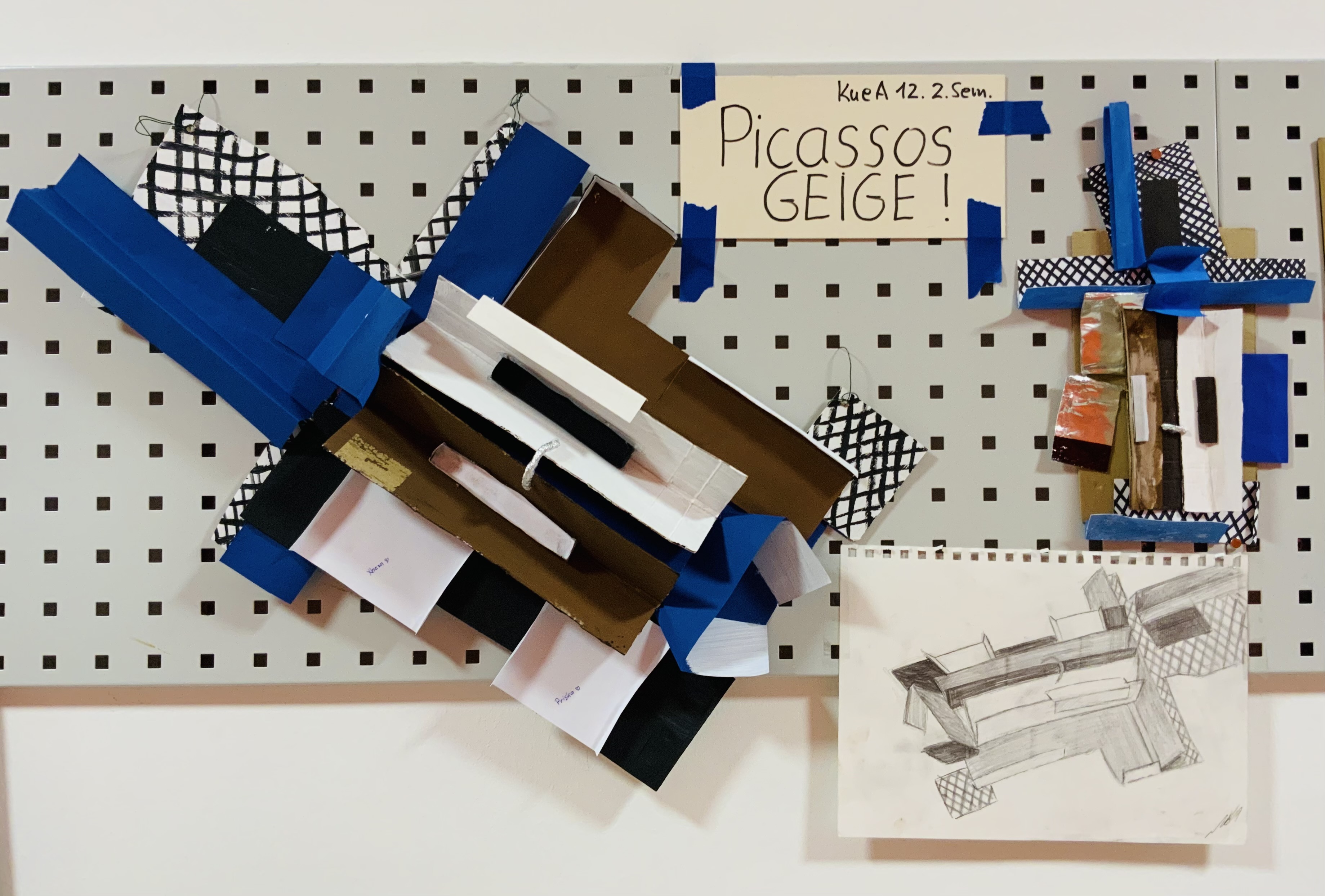 (DOR/PIP) In einer kleinen Ausstellung im Flur zu den Kunsträumen kann man einem berühmten Werk des Künstlers begegnen: Picassos „Violine“, eine abstrakte Assemblage (das ist eine Collage aus verschiedenen Materialien) ist derzeit Thema im Kunstkurs 12 auf erhöhtem Niveau und Vorgabe für das Zentralabitur 2027.