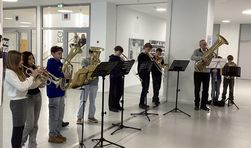 Feierlich eröffnet wurde der Tag durch die Blechbläser, die sowohl die deutsche als auch die französische Nationalhymne spielten. Anschließend konnten die Schülerinnen und Schüler bei vielfältigen Mitmachangeboten die Kultur unseres Nachbarlandes entdecken. Auch kulinarisch war einiges geboten – mit deutschen und französischen Spezialitäten, die zum Probieren einluden.